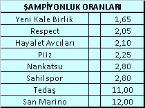 Maç Oranları Merhaba, her hafta eğlence amaçlı lig maçlarına oranlar vereceğiz. Bu oranların herhangi bir ciddiyeti yoktur. Her hafta maçlarınıza verilen oranları bu sayfadan takip edebilirsiniz. Şampiyonluk Oranları *her hafta güncellenecektir.
